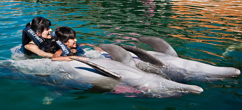 Later on, take an exciting ride at full speed on the dolphin’s belly holding on to its pectoral fins (Belly Ride). We end our program with a spectacular activity that can only be defined as the best experience of your life. Feel the rush of being pushed at top speed by your feet by two dolphins across our main pool! (Foot Push) Live the magic of swimming with dolphins.